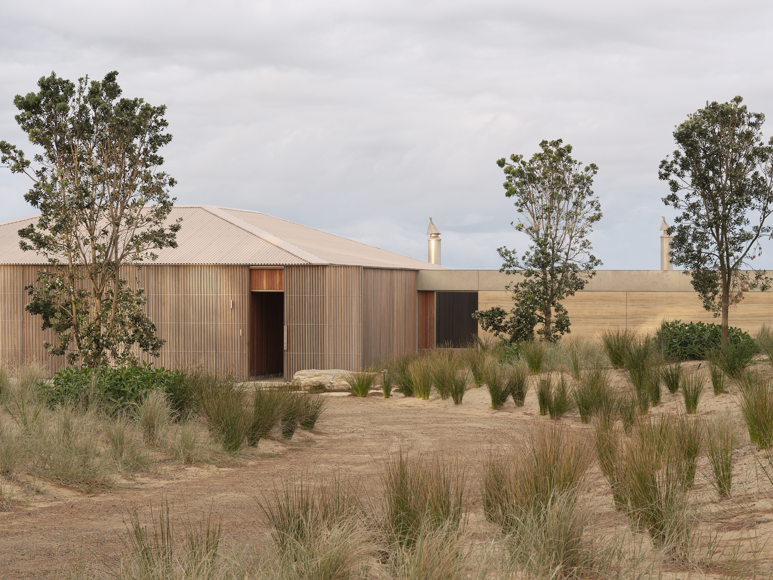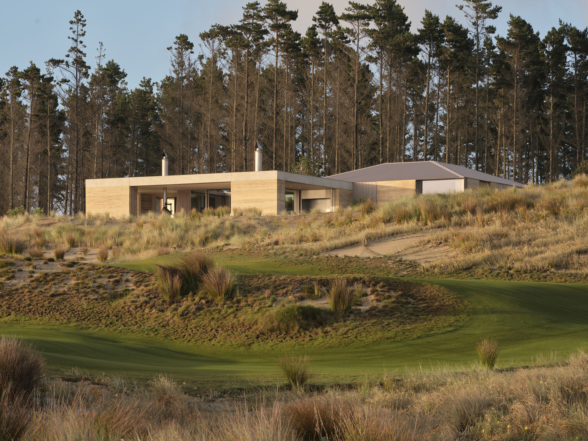 The site thoughtfully responds to the undulating terrain and native ecosystems, with earthworks and planting strategies carefully calibrated to preserve sightlines, natural drainage, and the integrity of the coastal environment.