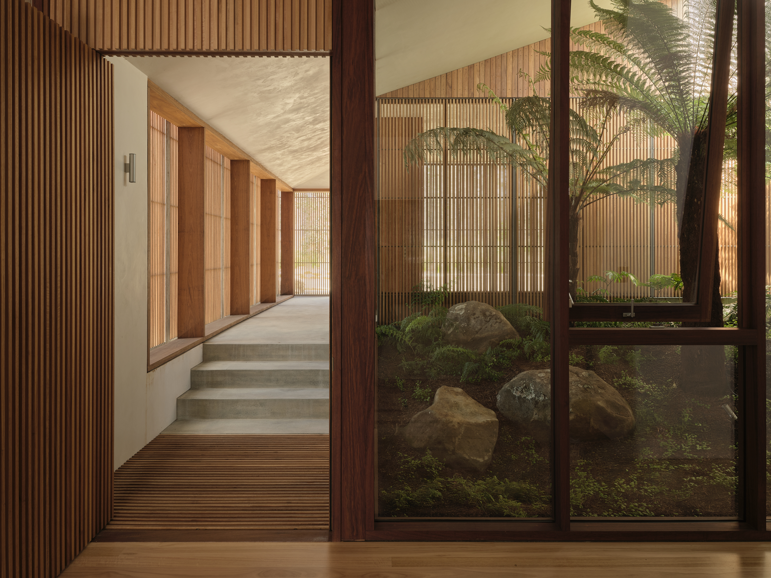 A wild, quintessentially New Zealand landscape meets refined restraint through a considered palette of planting, supporting a site shaped around two distinct internal gardens. One is enclosed and sheltered offering a cool, shady retreat layered with native tree ferns and groundcovers; the other is more open to the sun and coastal elements, where large stone slabs create an informal terrace softened by low groundcovers threaded between them like mortar.