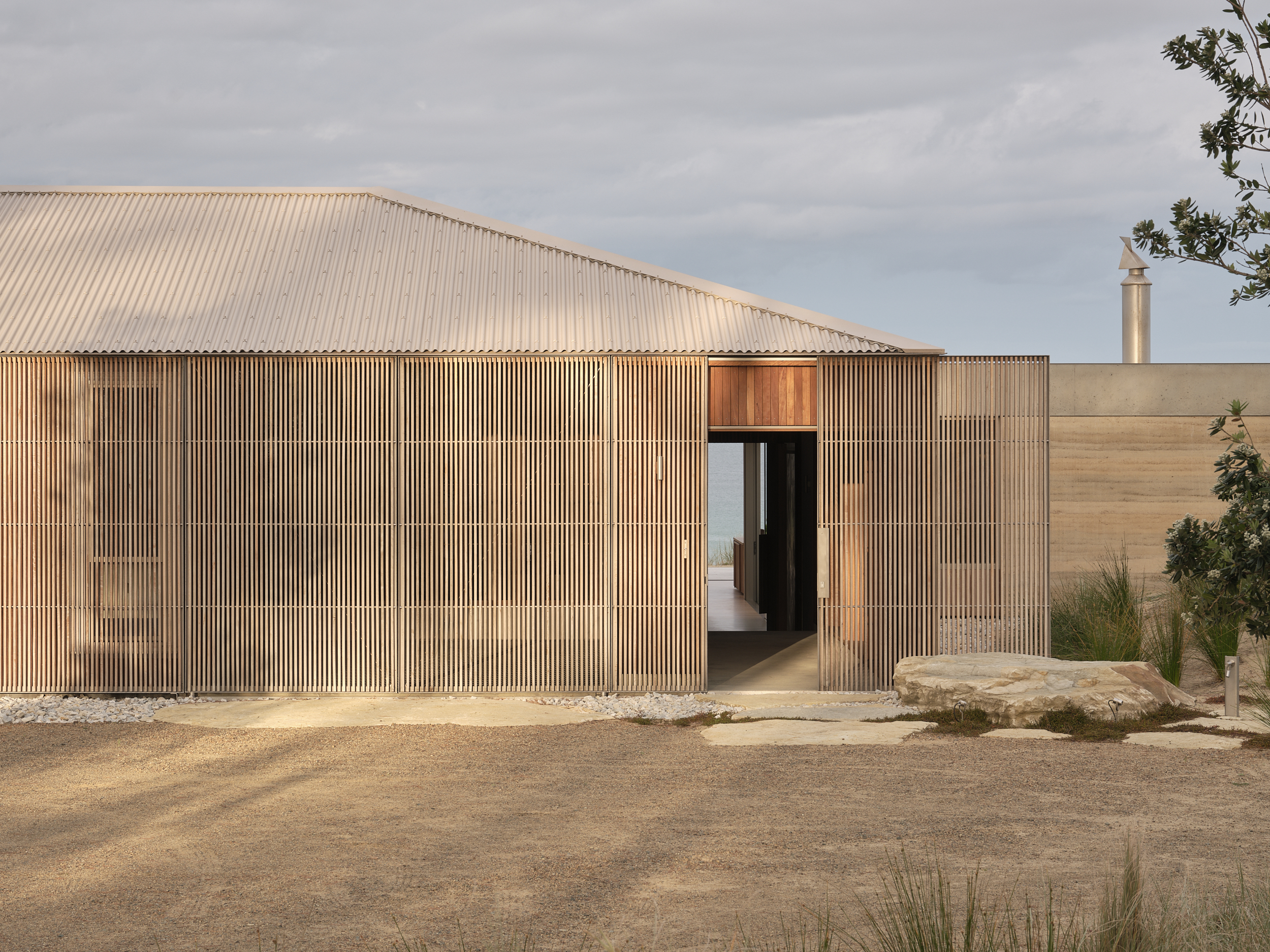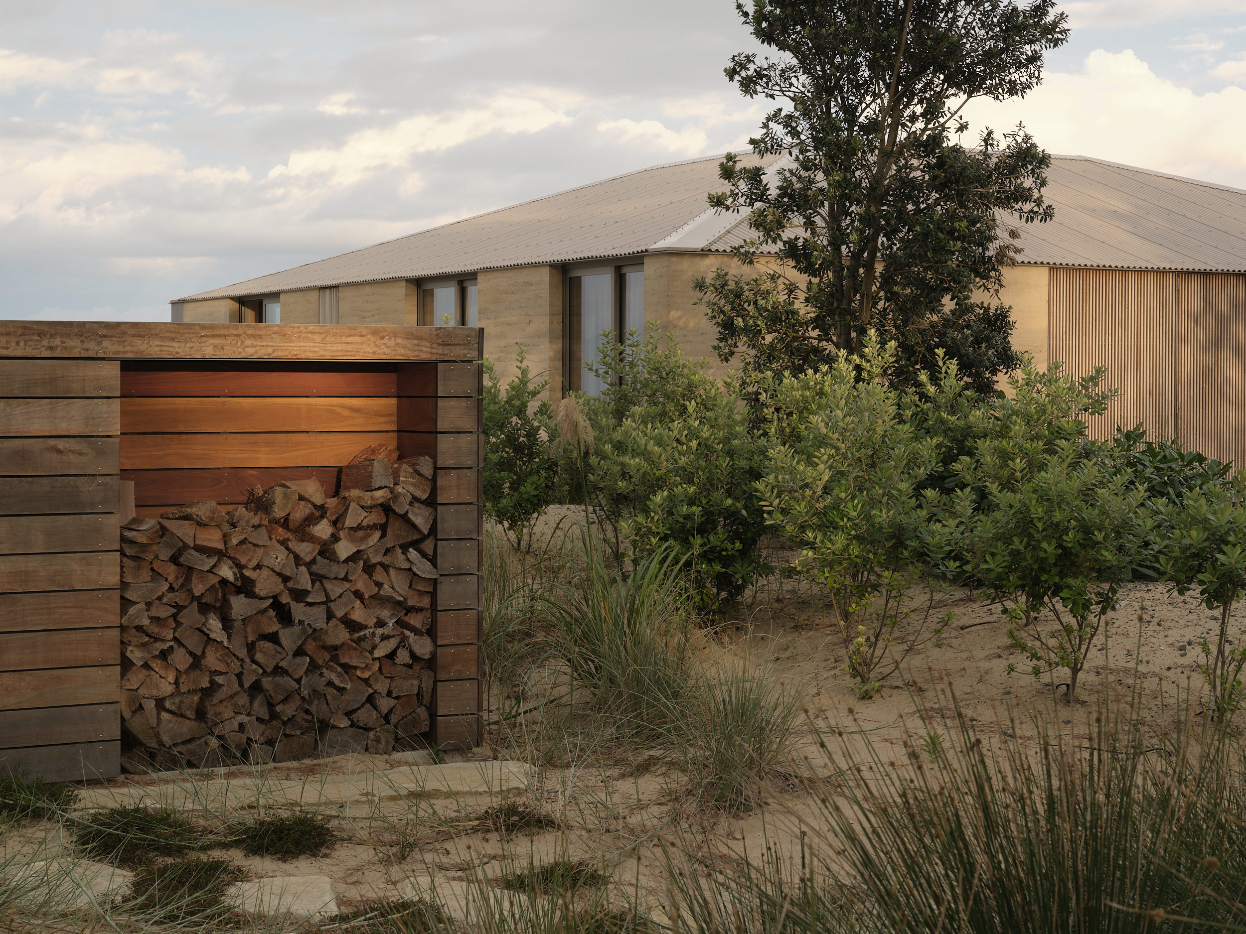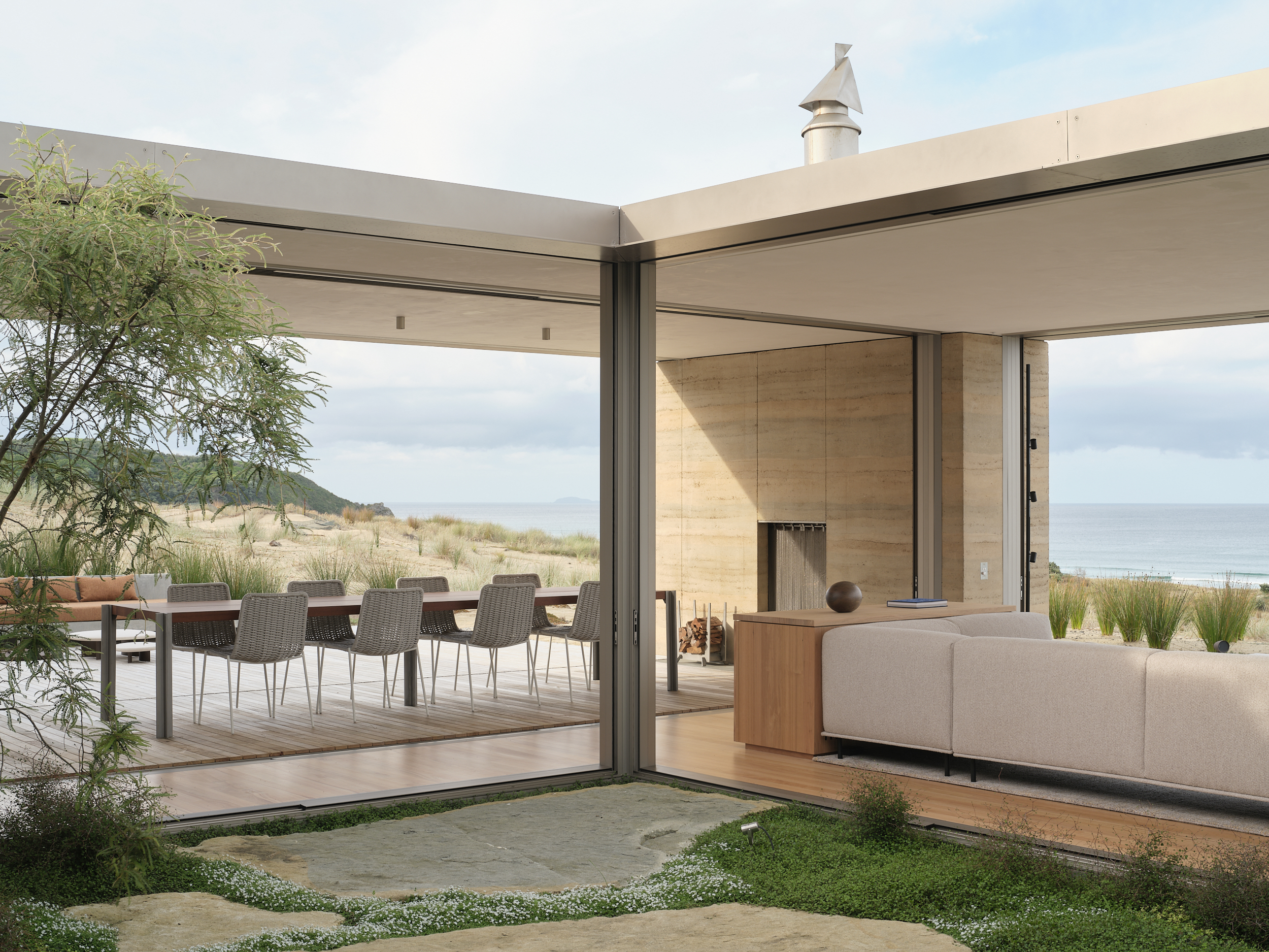 The house sits lightly within the sand dunes, where large drifts of spinifex and ficinia roll up towards the home, and Pōhutukawa trees punctuate the arrival sequence.