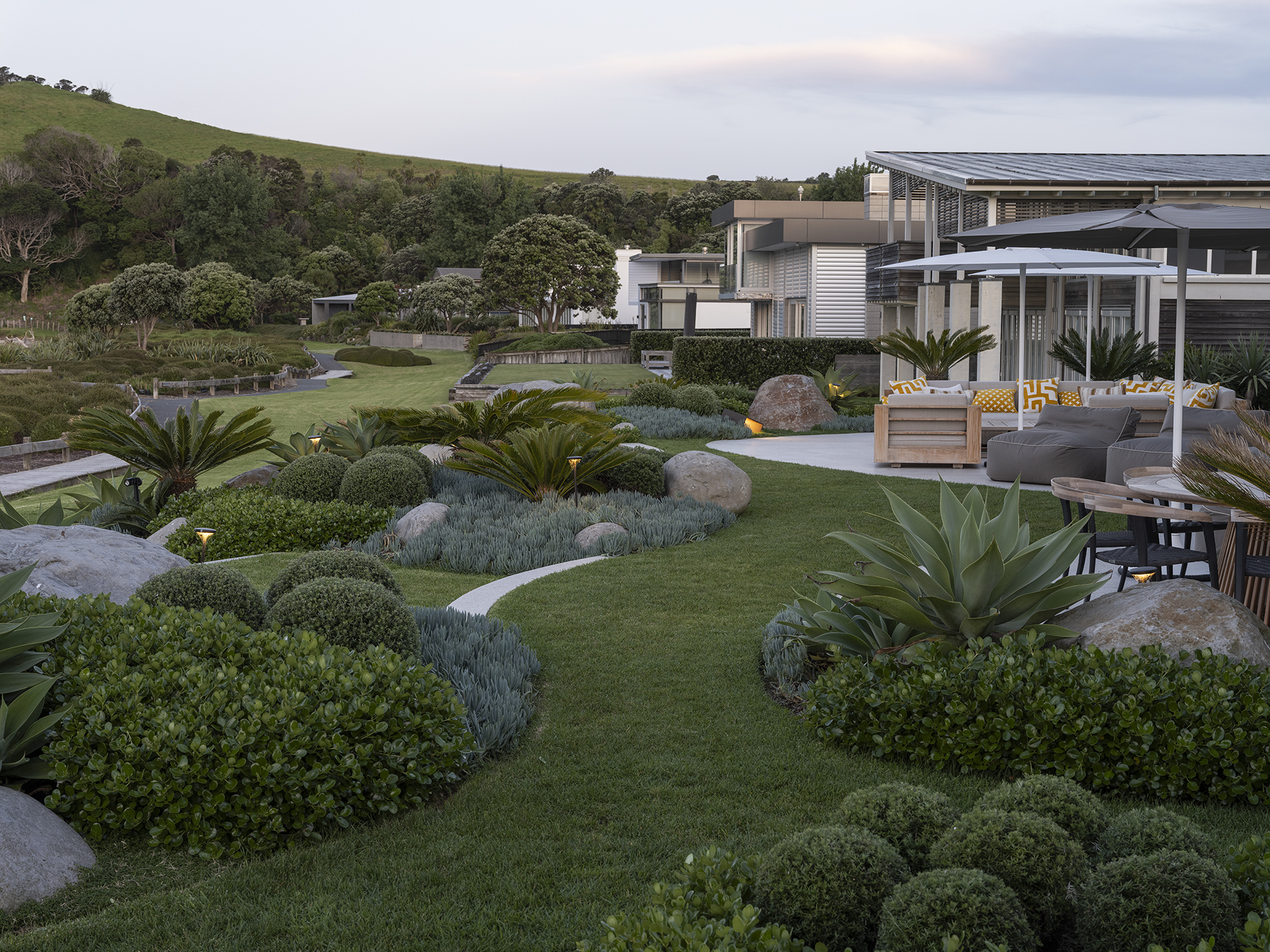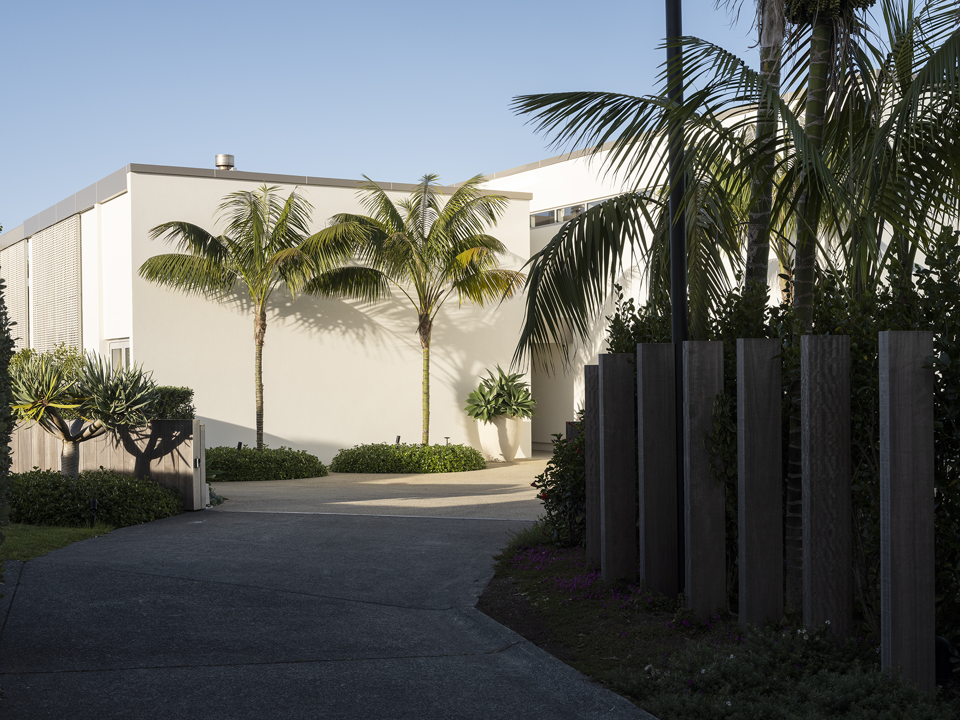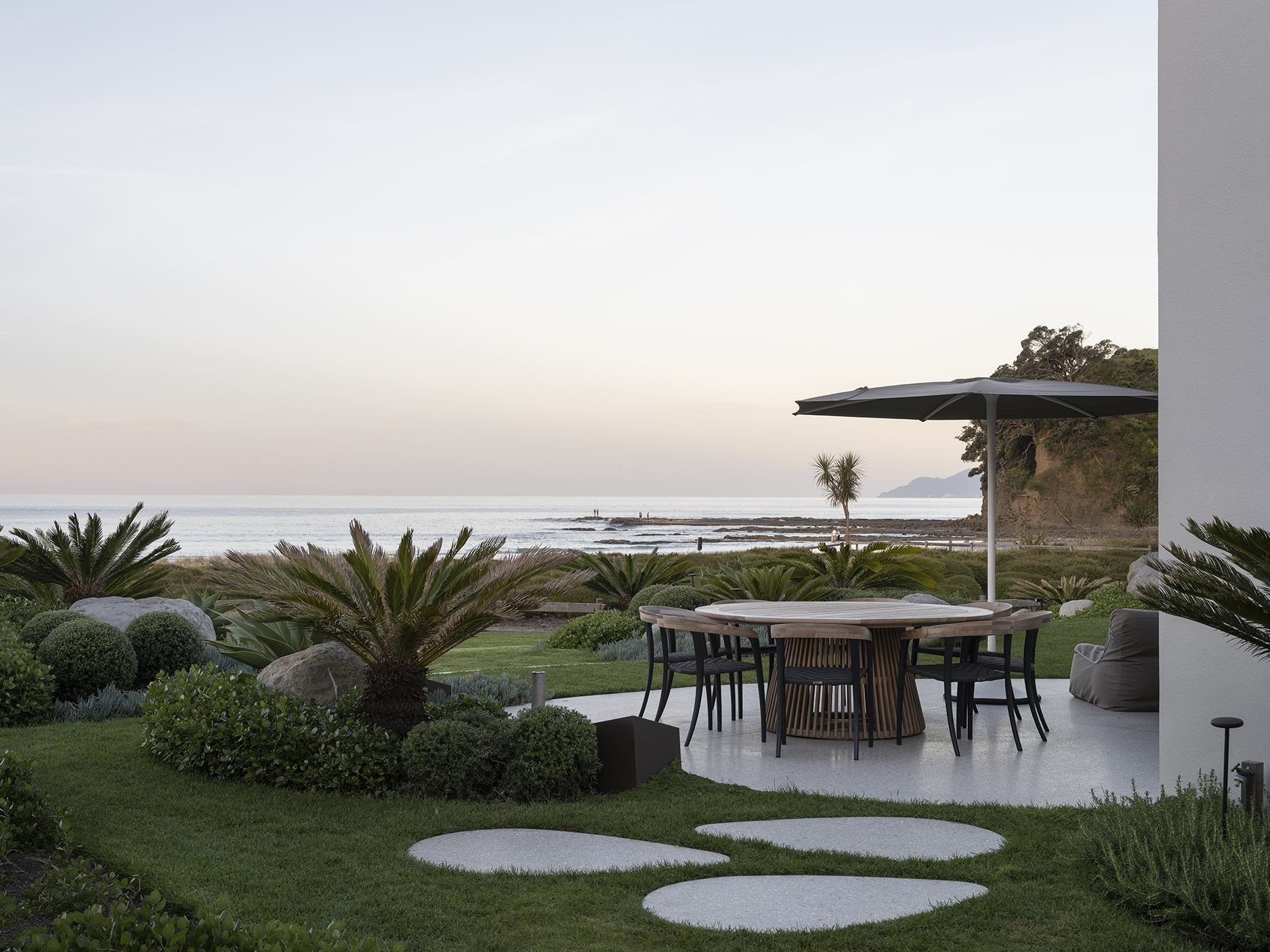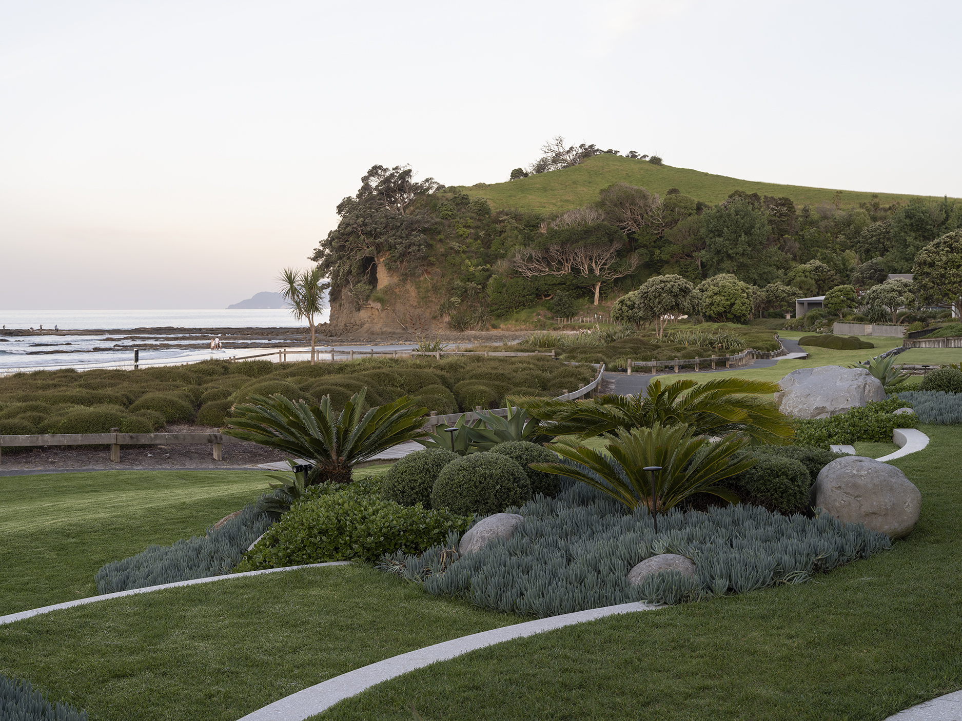 With panoramic views to Te Hauturu-o-Toi (Little Barrier Island), this coastal landscape unites two neighbouring properties into a single, cohesive estate, seamlessly aligned with contemporary architectural renovations led by Sumich Chaplin Architects. Developed in close collaboration with the client, the site highlights their desire to avoid straight lines, but rather, to embrace undulating, flowing curves. This concept is supported by the client’s preference for layering sculptural plants for immediate impact and presence, responding to the exposed nature of the site and keeping it intentionally low to preserve the beach views from within.